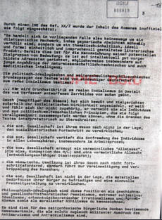 Es handelt sich im vorliegenden Falle also keineswegs um ein dilettantisches Machwerk, indem gegnerische Absichten mühselig verhüllt sind, sondern um ein thematisch-inhaltlich, ideell und formal einheitlich und anspruchsvoll gestaltetes literarisches Produkt. Bereits dies ist für die Kennzeichnung seiner potenziellen Zielgruppen von Bedeutung: es ist auf intellektuell gut vorgebildete Adressaten gerichtet, möglicherweise insbesondere auf junge Angehörige der naturwissenschaftlich-technischen und auch medizinischen Intelligenz.Die politisch-ideologischen und weltanschaulich-philosophischen Grundaussagen des Textes sind von einer eindeutigen Gegnerschaft zum realen Sozialismus bestimmt.“ (Auszug aus der STASI-Akte des „Staatsfeindes“)